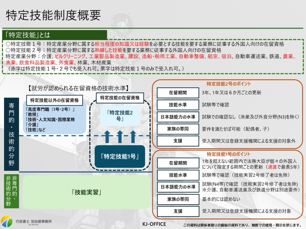 特定技能2号は、1号と比較してより高度な技能が求められる一方、在留期間の制限がなく、家族の帯同も可能となるなど、長期的な就労を前提とした制度設計となっています。