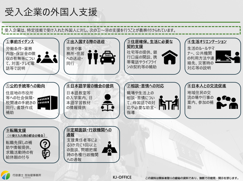 特定技能1号で外国人を受け入れる企業は、以下の10項目の支援を行うことが義務付けられています。これらの支援は、外国人が日本で安定して働き、生活できるようにするための重要な取組みです。
