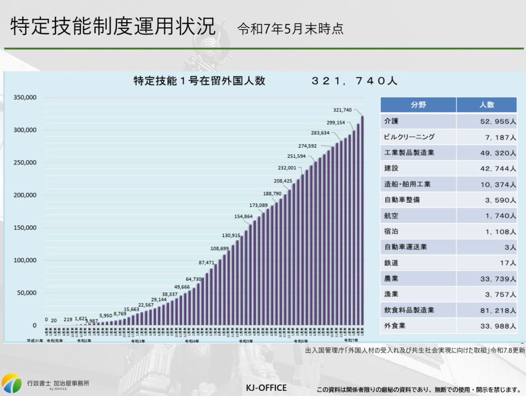 令和7年5月末時点で、特定技能1号在留外国人数は321,740人に達しており、特に介護(52,955人)、飲食料品製造業(81,218人)、工業製品製造業(49,320人)、建設(42,744人)などの分野で多くの外国人材が活躍しています。