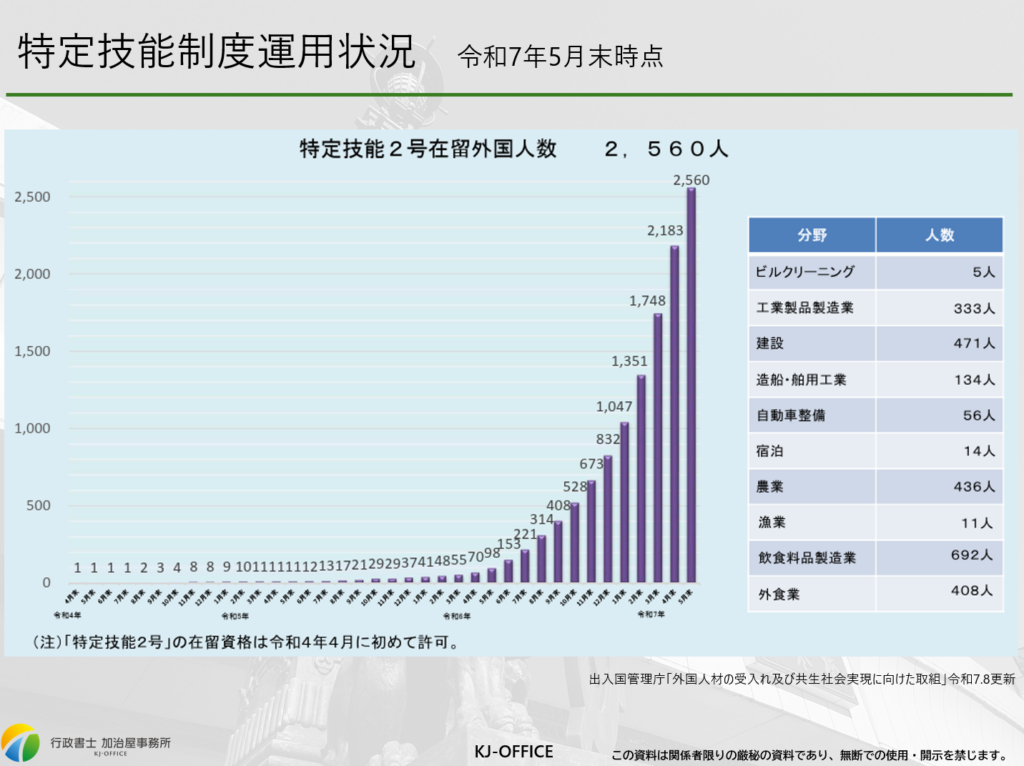 特定技能2号については、令和4年4月に初めて許可され、令和7年5月末時点で2,560人となっています。建設(471人)、飲食料品製造業(692人)、外食業(408人)などが主な分野です。