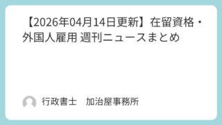 週刊ニュース 【2026年04月14日更新】在留資格・外国人雇用 週刊ニュースまとめ ```html今週のハイライト今週は、特定技能「外食業」での新規受け入れ一時停止という重大なニュースが飛び込んできました。外食業界を中心に大きな影響が予想される中、厚生労働省による外国人雇用管理の指針見直しや、建設業・運送業での外国人採用動... 2026.04.14 週刊ニュース